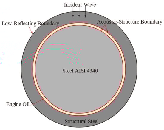 In this study, in order to verify the validity of the acoustic model, a two-dimensional finite element analysis was performed using COMSOL software(6.2). The finite element model is shown in Figure 3, and the solid mechanics interface and the pressure acoustics interface (transient) were used for the calculation. In order to simplify the calculation, we assume that the coupling problem of the probe can be ignored and the excitation signal is applied directly at the model boundary. The outer material of the model is structural steel, the oil film material is engine oil, and the inner material is AISI 4340 steel. All materials are considered as linear elastomers, and the nonlinear and viscoelastic behaviors of the materials are neglected. The oil film is considered as an ideal liquid and the density and speed of sound are constants. Also, to reduce the computational complexity, the three-dimensional problem is simplified to a two-dimensional model. This simplification is reasonable when exploring the properties of acoustic wave propagation in a plane, but care should be taken that three-dimensional effects may be neglected.