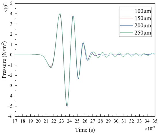 The different thicknesses of the oil film will affect the waveform characteristics of the reflected acoustic waves. Multiple sets of various thicknesses of oil films are simulated based on the application range of the acoustic model. The oil film thickness is set to 100 μm, 150 μm, 200 μm, and 250 μm respectively, and the simulation results are represented using pressure. The reflected acoustic pressures for different oil film thicknesses are shown in Figure 4. It can be observed that with increasing oil film thickness, the amplitude of the reflected acoustic pressure gradually increases, and there is a noticeable difference in the reflected acoustic pressure among oil films of different thicknesses. To enhance the resolution of the spectrum, we reduced the interval of frequency domain sampling. This adjustment allows us to more finely capture the effects of oil film thickness on the acoustic wave reflection characteristics. Specifically, we compressed the data sampling interval time and applied a higher resolution Fourier transform to the collected data to more accurately analyze the frequency components and phase changes.