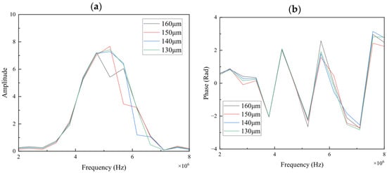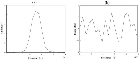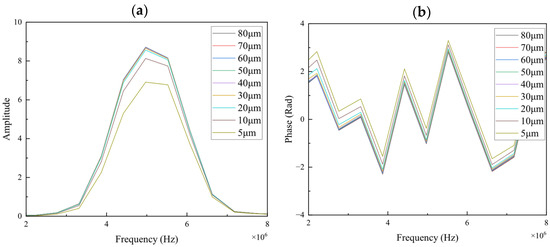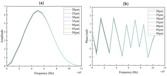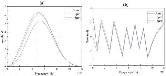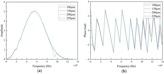 The time-domain signals in Figure 13 are subjected to a discrete Fourier transform to obtain the amplitude and phase of the reflected acoustic wave signals in the frequency domain, as shown in Figure 14a and Figure 14b, respectively.