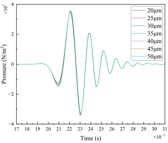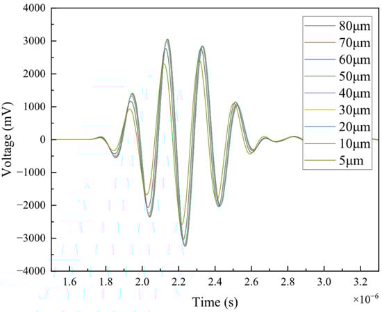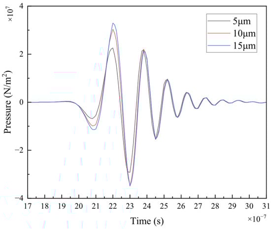 When the oil film thickness of the bearing ranges from 1 to 15 μm, the oil film is too thin for resonance effects between the ultrasonic waves and the oil film. Therefore, it is not feasible to calculate the oil film thickness using the resonance model within this range. Instead, the spring model is commonly employed to analyze the relationship between the oil film thickness and the ultrasonic reflection coefficient [42]. In the finite element model, oil films with thicknesses of 5 μm, 10 μm, and 15 μm are respectively set to examine the influence of the oil film thickness on the reflected acoustic waves. The results of the finite element analysis are depicted in Figure 6. When the oil film thickness in the model is less than 5 μm, higher precision is required for the model grid, leading to increased computational demands. Therefore, the analysis of the oil film thickness’s impact on the reflected acoustic waves does not start from 1 μm.