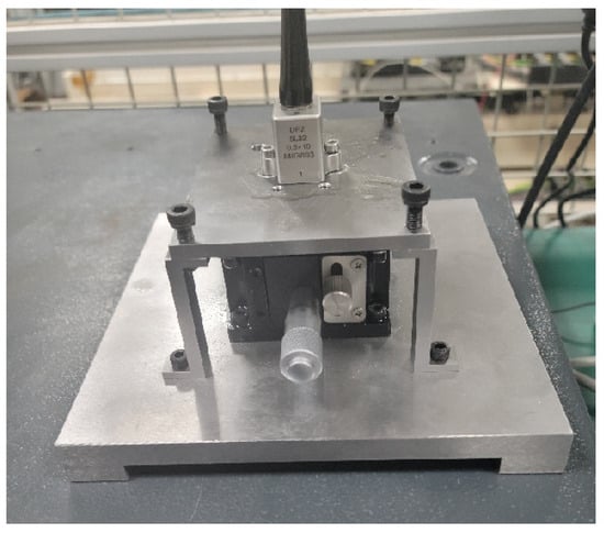 The probe and test block are directly fixed on the calibration table during the experiment, as shown in Figure 10. To ensure good acoustic-solid-liquid coupling between the ultrasonic probe and the test block surface, the detection surface must be polished smoothly to maintain flatness. This provides excellent contact between the ultrasonic transducer and the bearing housing, resulting in more accurate detection results. Throughout the experiment, temperature variations can affect the ultrasonic test results. Therefore, it’s essential to maintain stable laboratory temperatures to avoid significant fluctuations that could affect the test results. For instance, when the indoor temperature increases from 21.9 °C to 22.1 °C, the change in ultrasonic delay compared to the data for measuring oil film thickness can be considered negligible. It can also be assumed that when the laboratory temperature varies within the range of ±0.2 °C, its impact on the measurement results of bearing oil film thickness detection is minimal, and this error can be disregarded.