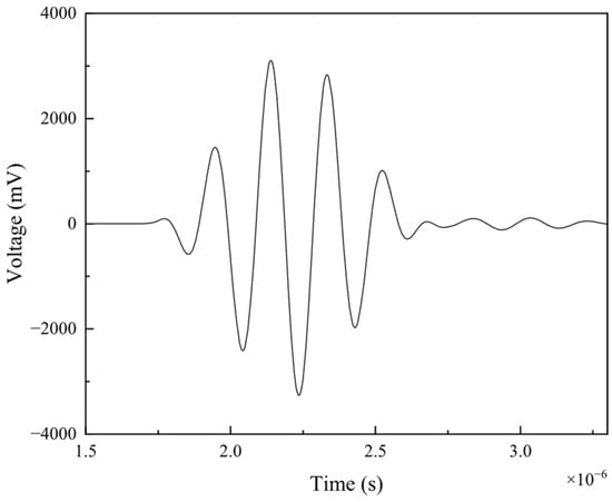 After completing the construction of the oil film thickness calibration experimental platform, clean the surface of the upper and lower test blocks on the platform to ensure that there are no impurities, so as not to affect the experimental accuracy. Apply lubricant to the contact area between the upper test block and the ultrasonic probe to ensure the coupling efficiency. At the same time, constantly adjust the degree of contact between the ultrasonic probe and the surface of the test block to achieve the best coupling effect. When the displayed reflected ultrasonic waveform reaches the maximum value, it indicates that the coupling effect is optimal. After adjusting the ultrasonic probe, the reflected ultrasonic signal at the interface between the upper test block and the air is recorded as the reference signal. The time-domain waveform information of the reference signal represents the reflected signal at the contact surface between the test block and air, as shown in Figure 11.