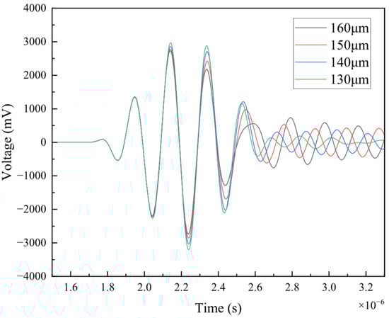 Using a displacement platform, the oil film thickness was controlled within the calculation range of the resonance model, with oil film thicknesses set at 160 μm, 150 μm, 140 μm, and 130 μm for the measurement of reflected sound waves. Figure 13 shows the time-domain signals for different oil film thicknesses within the resonance model range. The amplitude of the reflected sound waves does not vary significantly. Due to the relatively thick oil film layer, there are a series of small amplitude echoes in the reflected sound waves after 2.5 μs, and the superposition of adjacent echoes causes the resonance effect of the reflected sound waves. The amplitude of the echoes decreases with the decrease in oil film thickness. When the amplitude of the echoes reaches 0, the reflected sound waves leave the calculation range of the resonance model. As a result, the accuracy of analyzing the oil film thickness change through the resonance model decreases, and the resonance model is no longer applicable.