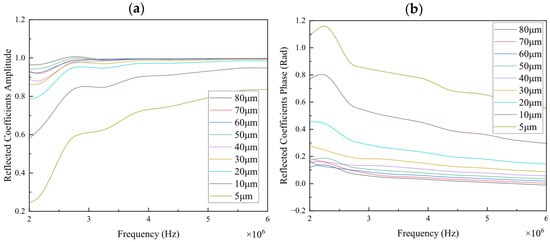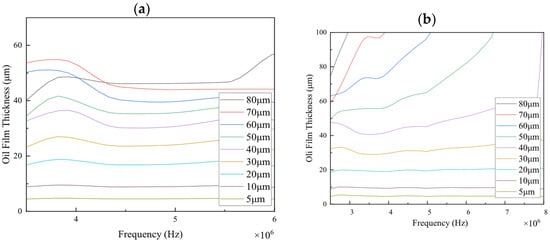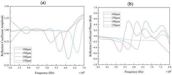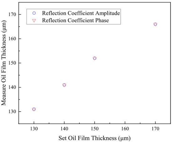 In Figure 14a, apparent resonance phenomena can be observed, where the minimum points in the amplitude curve represent resonance points corresponding to resonance frequencies. Moreover, the resonance points gradually shift to the right as the oil film thickness decreases. In Figure 14b, the phase curve of the reflection coefficient exhibits distinct resonance phenomena near the resonance frequency. When the flat curve exhibits fluctuations, resonance occurs, with the frequency at resonance corresponding to the resonance frequency. As the oil film thickness decreases, the resonance points gradually shift to the right. The corresponding oil film thickness can be calculated based on the respective resonance frequencies in both the amplitude and phase of the reflection coefficient.