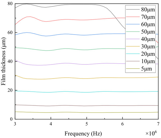 The reflection coefficient phase from Figure 18b was substituted into Equation (10) to calculate the oil film thickness using the phase shift model, as shown in Figure 20. When the oil film thickness is between 5–10 μm, the oil film thickness curve is relatively smooth, and the trend is roughly similar to the calculation results of the spring model. When the oil film thickness is between 20–70 μm, fluctuations occur with increasing thickness in the oil film thickness curve. Within the range of oil film thickness variation, there is no crossover phenomenon among the oil film thickness curves calculated by the phase shift model, and the differences between the curves are significant, demonstrating the effectiveness of the phase shift model in calculating the oil film thickness.
