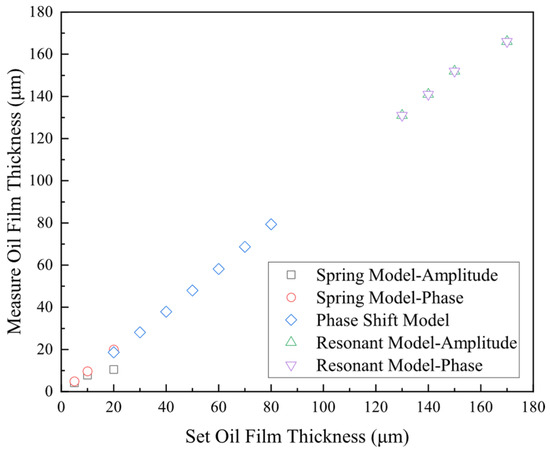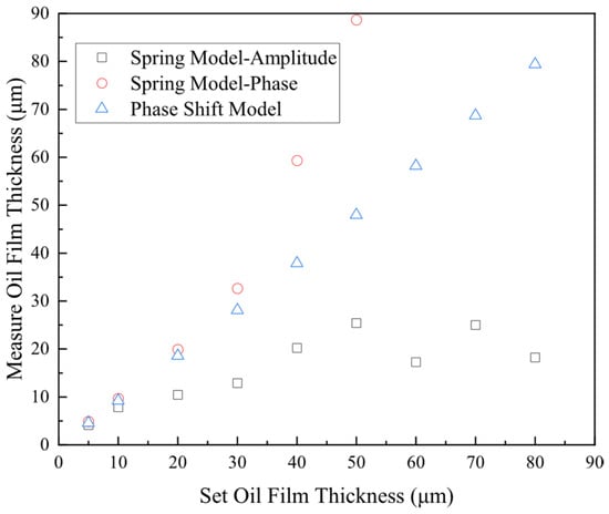 When the oil film thickness calculated by the spring model is relatively thin, the results obtained from both amplitude and phase are close to the set thickness. However, as the oil film thickness gradually increases, the calculated results from the spring model deviate from the set thickness, with the amplitude calculation results tending to underestimate and the phase calculation results tending to overestimate. The phase shift model maintains a certain level of accuracy during the measurement process, with the calculated oil film thickness being almost identical to the set thickness, demonstrating the accuracy of the phase shift model in measuring oil film thickness in the range of 20–80 μm.
