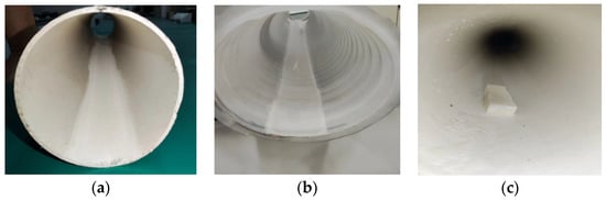 In this experiment, the variation in pipe diameter affected deposition. At consistent flow rates, the larger-diameter pipes had slower velocities than did the smaller-diameter pipes, resulting in faster deposition rates. Additionally, an increase in the slope resulted in a decrease in the deposition thickness. In the presence of foreign obstacles, the local deposition rates accelerated. The sedimentation formed at the rear of the foreign object was less even and greater, which may be owing to the reduced velocity and increased turbulence caused by the disturbance of the foreign object (as shown in Figure 4c). Evident white sediment was observed attached to the pipe wall and the texture of the generated crystalline material was fine. The calcium carbonate on the surface was loosely attached, resulting in it being highly prone to falling off. In contrast, the calcium carbonate that had strong adherence had a certain hardness, making it less prone to falling off (Figure 4a,b).