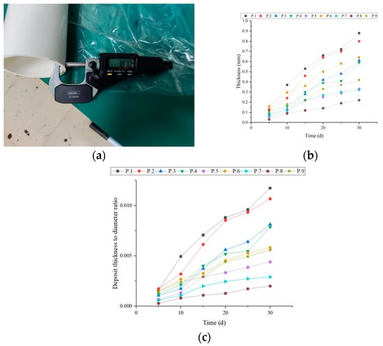 (a) Schematic of thickness measurements. (b) Deposition thickness trend for each pipe. (c) Deposit thickness to diameter ratio.