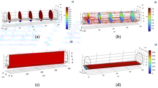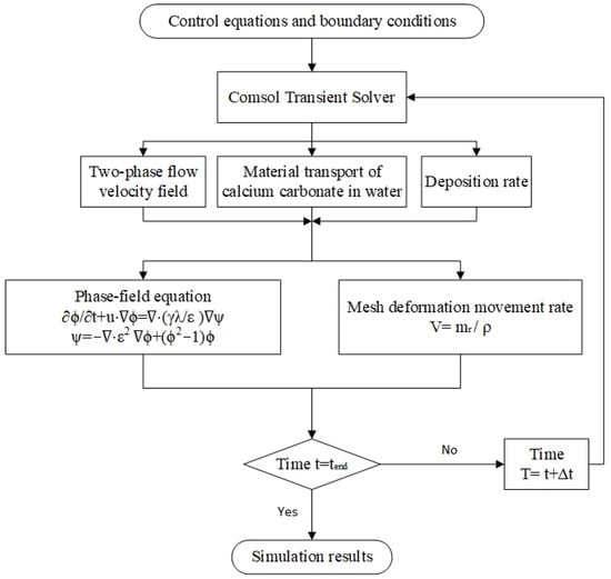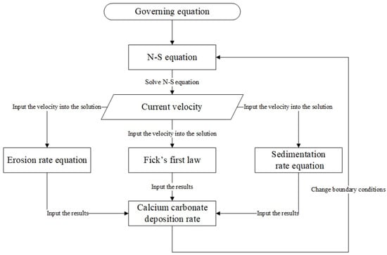 The intercoupling of the aforementioned equations is illustrated in Figure 7, where the erosion rate equation is coupled with the Navier–Stokes equation through the flow velocity u, and the mass-transfer equation serves as an intermediate bridge. The flow and chemical fields are coupled through the flow velocity u and reactant concentration c. The deposition thickness equation is coupled with the mass-transfer equation through the concentration c, and it is also coupled with the Navier–Stokes equation through the flow velocity u:
