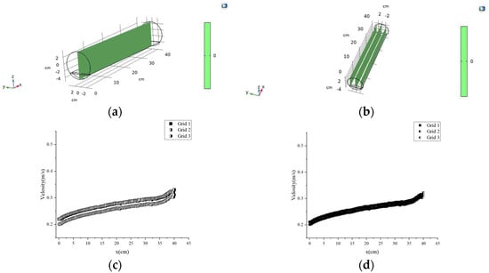Owing to the regularity of the present model, the built-in meshing algorithm of the COMSOL version 6.1 system was employed. The grid independence was assessed by selecting Plane A, which lies along the longitudinal centerline of the pipe (y = 0), and Plane B, which is 2 cm away from Plane A (y = 2 cm). The analysis was conducted by examining the longitudinal velocity profiles on Planes A and B. As Figure 9 illustrates, taking the calculation results of Pipe 1 as an example, the grid independence was verified by ensuring that the fluctuation in the longitudinal velocity magnitude did not exceed 5%. Considering the balance between the accuracy of the simulation results and the computational effort, the refined mesh count for the system was determined to be 36,758,920.
