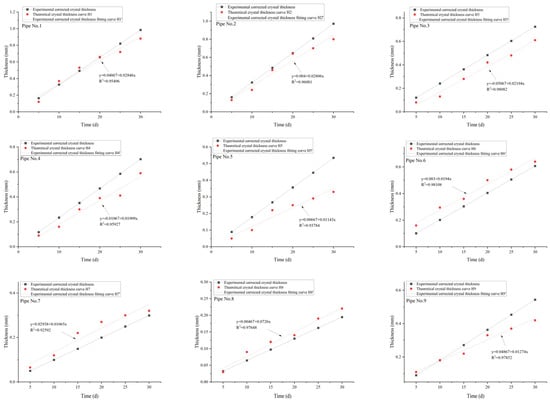 From the upper left to the lower right, the simulation deposition thicknesses for conditions 1–9 are compared with the actual measured thicknesses and the linear fitting of the actual measured thicknesses.