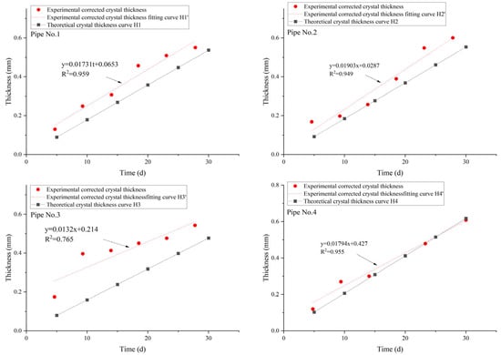 It appears that the No. 5 pipeline might have undergone a considerable impact, owing to a fall during the initial phase of measurement. As indicated in Section 3.2, the susceptibility of crystals to detach during the handling process could have destroyed the deeply embedded crystal structures within the pipe walls after the impact. This disruption may have had a deleterious effect on the subsequent formation of crystals. Simultaneously, the simulation results indicate that the degree and trend of deviation are both most pronounced. The rationale for retaining this set of data is that, within the 30 d experimental period, condition 5 still somewhat reflects the sedimentation trend, indicating that higher flow velocities correspond to lower sediment deposition. As for the issue of significant deviation in the model for smooth pipes under high flow velocities, the deviation does indeed exist, and ongoing research is being conducted to address this matter.