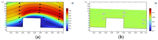 (a) Local velocity cloud and (b) concentration transfer diagrams of an obstruction. The arrow represents the streamline of the flow field.