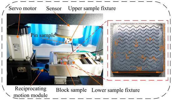 The experiment utilized an FTM M30 multimodule controllable lubrication friction tester (Nanjing Shenyuansheng Intelligent Technology Co., Ltd., Nanjing, China), as depicted in Figure 1, which adopted pin-on-block reciprocating friction. The friction test employed 45# steel (AISI 1045) cylindrical pins and 45# steel blocks as the test materials. The upper sample was a cylindrical pin made of 45# steel, having a diameter of 6 mm and a length of 15 mm. The lower sample was a 45# steel block sized 20 mm × 20 mm × 10 mm. The lubricant utilized was 32# Moroke high-quality guide rail oil, and the environmental temperature for the friction test was 20 °C.