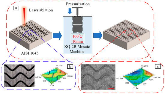 Schematic diagram of specimen preparation: (a) Laser ablation diagram. (b) Micro-texture before filling. (c) Micro-texture after filling [20].