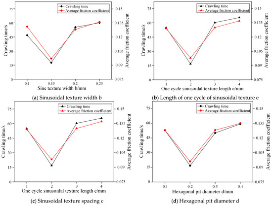 When b = 0.15 mm and d = 0.2 mm (as shown in Figure 4d), the crawling time initially decreases and then increases as the length of one cycle of the sinusoidal texture e and the sinusoidal texture spacing c increase. Similarly, when b = 0.15 mm and c = 1.5 mm (as depicted in Figure 4e), the trend is similar for increases in the length of one cycle of the sinusoidal texture e and the diameter of the hexagonal pits d.