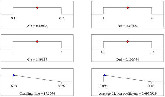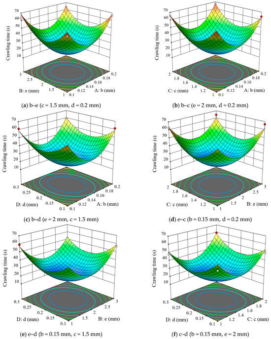 When b = 0.15 mm and e = 2 mm (as shown in Figure 4f), the crawling time decreases and then increases as the sinusoidal texture spacing c and the diameter of the hexagonal pits d increase. By comparing the steepness of the interaction effect plots for b–e, b–c, b–d, e–c, e–d, and c–d, it can be observed that the primary factor affecting crawling time is c, followed by e, then d, and finally b.