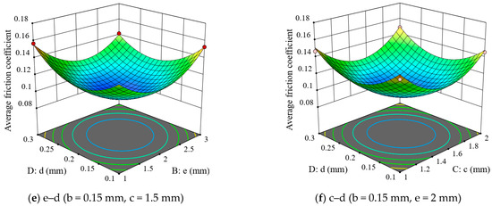 For Figure 5d, with b = 0.15 mm and d = 0.2 mm, the average friction coefficient decreases initially and then increases as the length of one cycle of the sinusoidal texture e and the sinusoidal texture spacing c increase. Figure 5e indicates that when b = 0.15 mm and c = 1.5 mm, there is a decrease followed by an increase in the average friction coefficient as e and d increase. Finally, in Figure 5f, when b = 0.15 mm and e = 2 mm, the average friction coefficient follows the same trend with the increase in c and d. By comparing the steepness of the interaction effect graphs for b–e, b–c, b–d, e–c, e–d, and c–d, it can be ascertained that the primary factor influencing the average friction coefficient is c, followed by e, then b, and lastly d.