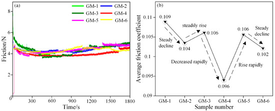 In light of the diverse mass ratios of mixtures consisting of guide rail oil and molybdenum disulfide (MoS2), the samples were coated and subsequently underwent high-temperature embedding. The mass ratios and the microhardness of the embedments are depicted in Table 3. In Figure 7, the graphs depict the curves of the friction force and the average friction coefficient under low-speed, heavy-load conditions for diverse mass ratios of guide rail oil to MoS2. The graphs suggest that all the friction force curves diminish rapidly and subsequently stabilize. Moreover, the average friction coefficient varies with the ratio of guide rail oil to MoS2, attaining its nadir at a ratio of 2:1, which amounts to 0.096. This is attributed to the fact that, under low-speed, heavy-load conditions where the speed is low and the load is high, a greater amount of binding agent is requisite within the microstructures to prevent the swift loss of MoS2 during friction. This guarantees that the solid lubricant stored in the microstructures can gradually shift to the friction interface under high loads, achieving prolonged lubrication. Consequently, a ratio of 2:1 for guide rail oil to MoS2 exhibits exceptional anticrawling and friction-reducing performance under low-speed, heavy-load conditions.
