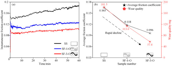 Figure 9 exhibits the instantaneous and average friction coefficients of diverse samples under normal operating conditions (load of 18 N). Observing Figure 9a, it is manifest that the SS (smooth surface) sample undergoes considerable fluctuations in the friction coefficient throughout the friction process. After 20 min of running-in, the friction coefficient commences to ascend. The SF-1-O (Optimal multistage lubrication structure (unfilled)) sample presents smaller fluctuations in the friction coefficient in comparison with the SS sample. After 18 min of running-in, the friction coefficient stabilizes at approximately 0.12 without any conspicuous upward tendency. The friction coefficient of the SF-3-O (Optimal multistage composite lubrication structure (fully filled)) sample is even stabler than that of the SF-1-O sample. It stabilizes after merely 3 min of running-in and settles at approximately 0.095.
