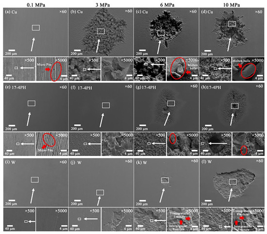 Liu et al. [8] conducted an extensive study on cavitation erosion across a range of pressure conditions, specifically 0.1, 3, 6, and 10 MPa. The study focused on three metallic materials: copper, 17-4PH stainless steel, and tungsten, which were selected as representative test specimens. Figure 2 presents field-emission scanning electron microscope (FESEM) images that reveal the morphology of cavitation-induced erosion pits on these materials under varying pressures.