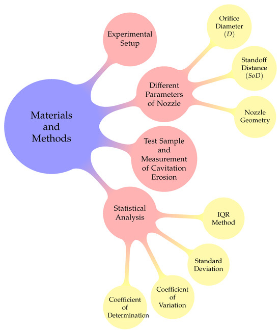Figure 3 illustrates a mind map outlining the sequential steps detailed in the materials and methods section of this paper. The diagram begins with an explanation of the experimental setup, followed by a description of the various nozzle parameters, including the orifice diameter, standoff distance, and nozzle geometry. It further elaborates on the procedures for preparing the test samples and measuring cavitation erosion. Our research methodology rigorously adhered to the specifications established in previous studies and conformed to ASTM G134 for cavitation erosion testing. This standard provides extensive guidelines on the design and operational parameters of the test equipment, which we diligently followed to ensure that our results are both valid and comparable. Finally, the mind map encompasses the statistical analysis methods employed in the research, specifically the interquartile range (IQR) method, standard deviation, coefficient of variation, and coefficient of determination.