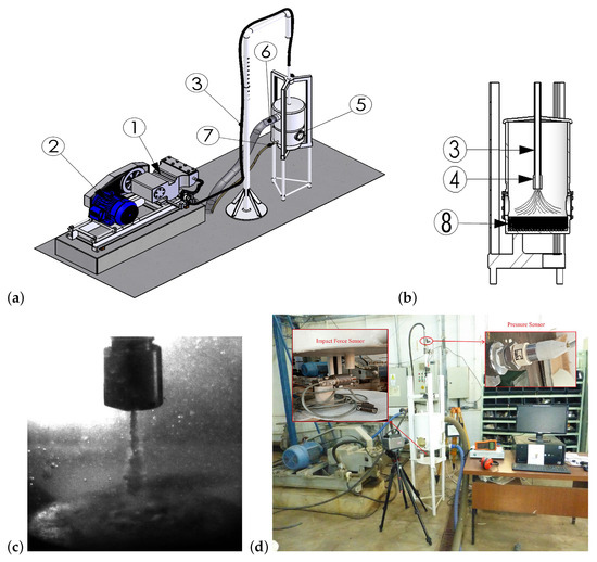 The experimental methodology employed in this study involved the generation of a submerged cavitating jet, which impinged on a stationary solid specimen submerged in a fluid medium, as depicted in Figure 4c. This interaction led to the formation and subsequent collapse of cavitation bubbles on the surface of the specimen, which resulted in erosive effects. To assess the cavitation erosion characteristics of solid materials, a specialized apparatus known as the cavitation jet apparatus (CJA) was utilized, as shown in Figure 4a,b,d.