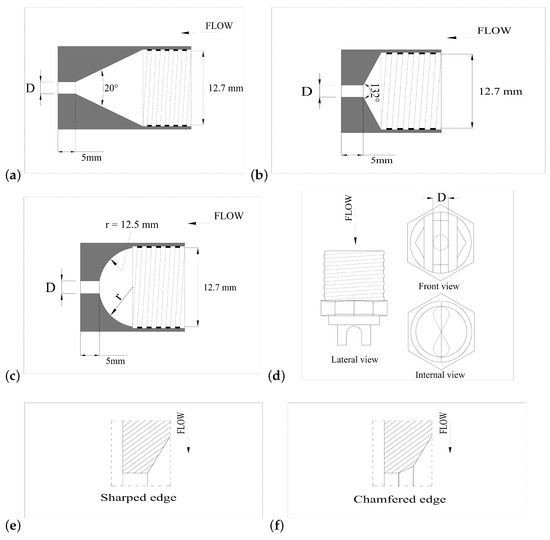 To maximize the cavitation erosion, various nozzle geometries were tested, including a 20° conical nozzle, a 132° conical nozzle, a circular nozzle with a radius of 12.5 mm, and the MEG2510 WashJet® Spray Nozzle (with a spraying angle of 25° and a flow rate capacity of 65 × 10−5 m3/s at a pressure of 300 kPa). These designs were selected to identify the most effective geometry for inducing cavitation erosion. For each nozzle type, two models were constructed: one that featured internal sharped edges and the other with internal chamfered edges (except for the MEG2510). The configurations of these nozzle models are illustrated in the sketches provided in Figure 6a–f. This comparative approach aimed to determine the nozzle geometry most susceptible to producing cavitation erosion, thereby providing insights into optimizing the nozzle design for such applications.