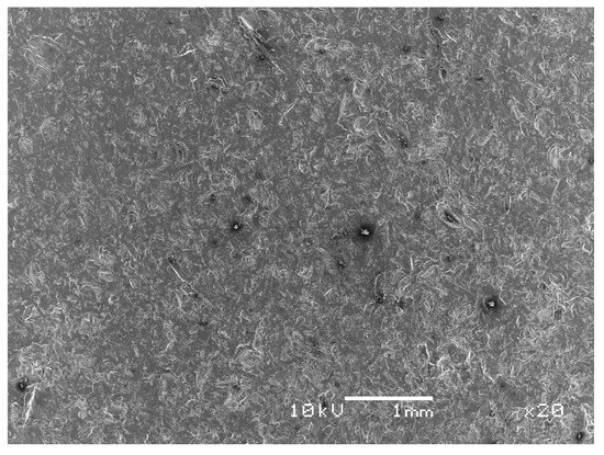 In line with the aforementioned research, an aluminum sample fabricated from alloy 6351-T6 was selected for the current study. The sample, with a diameter of 15 cm and a thickness of 6.5 mm, was positioned at the bottom of the tank to serve as a solid test specimen. The mechanical and physical properties, as well as the chemical composition of the aluminum alloy, are detailed in Table 1 and Table 2, respectively. Additionally, a scanning electron microscope (SEM) image of the aluminum sample is presented in Figure 7, which provides further insight into its surface morphology.