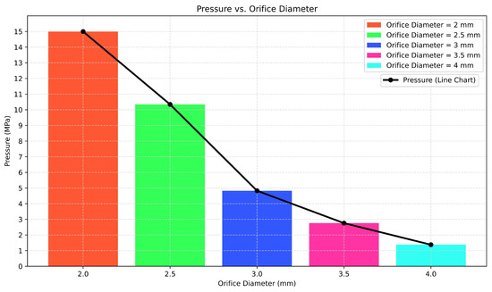 The CJA was investigated with various orifice diameters, as mentioned in Section 2.2.1. For this purpose, we used a nozzle with sharped edges. The pressure valve of the rig was adjusted to the maximum capacity of the plunger pump, which was approximately 15 MPa. By utilizing the maximum pressure capacity of the pump, different orifice diameters produced varying pressures, which were measured by a pressure sensor located upstream of the nozzle. The maximum upstream pressure for each orifice diameter is illustrated in Figure 9.