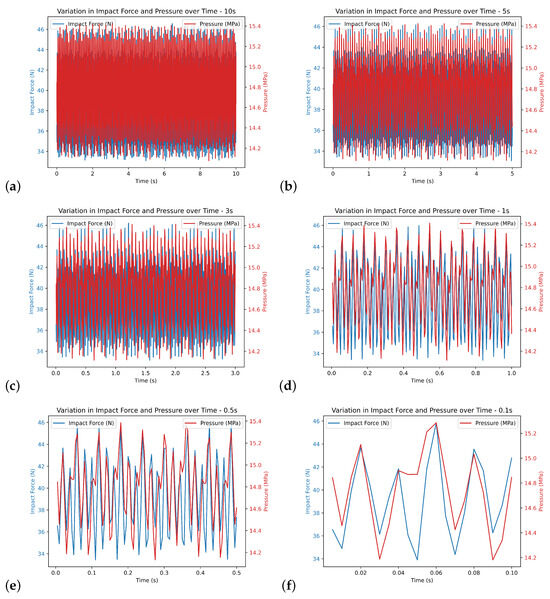 To monitor pressure oscillations, a pressure transducer (HBM, model: K-P8AP-231B-17A5, measurement range: 0–20 MPa) with an accuracy of was strategically placed upstream of the nozzle. Additionally, an impact force transducer (HBM, model: WAGEZELLE/Load Cell-Z6FD1, class D1, TC2207) with an accuracy of was installed on the external bottom layer of the tank in indirect contact with the solid sample. Both sensors were connected to a PC-based data acquisition system (Spider 8), with the data processed using Catman® Express V4.5 software. The pressure and impact force were measured and recorded at a sampling rate of 200 Hz.