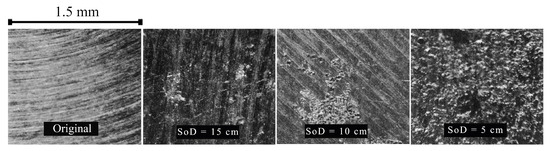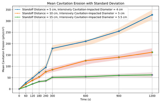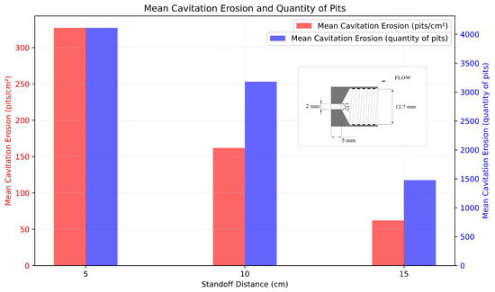 In the present study, the erosive impact of the cavitating jet on the aluminum specimens was evaluated by varying the SoDs to 5, 10, and 15 cm (with a tolerance of ±5 mm). These specific SoDs were selected to comprehensively assess the relationship between the SoD and cavitation erosion intensity.