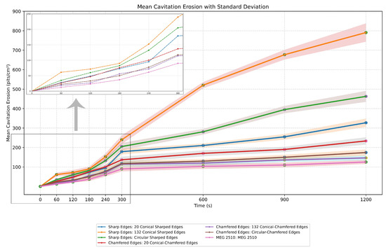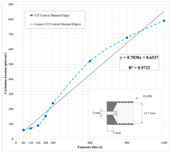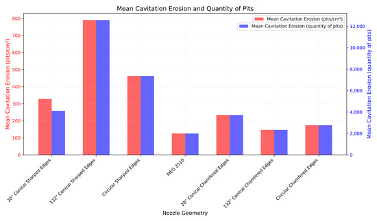 Multiple studies examined the relationship between cavitation erosion and varying nozzle pressures [63,74]. Their findings indicate that a reduction in pressure leads to a decrease in cavitation erosion. Consistent with these findings, our observation of pressure reductions associated with increasing orifice diameters (Figure 9) suggests that a larger orifice diameter results in reduced cavitation erosion.