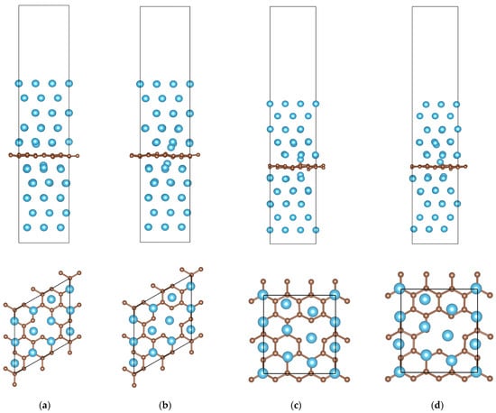 In commonly utilized titanium alloys, the structural composition predominantly consists of alpha titanium and beta phase or is solely comprised of beta phase. The incorporation of beta titanium alloys enhances the biocompatibility and overall mechanical properties of the material; however, it concurrently results in a decrease in the material’s elastic modulus [14]. The production of the beta phase in actual composite materials necessitates the introduction of other metallic elements, complicating the investigation of the effects of the crystal structure on the interfacial properties of the materials [15]. To examine the interaction between beta titanium and graphene within the composite material, as well as its impact on the mechanical properties, this study employs first-principles methods to investigate the interfacial bonding characteristics between pure titanium and graphene exhibiting various crystal structures.