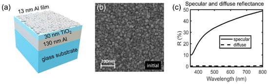 The TAFIM structure (see Figure 1a for a sketch) consists of a three-layer stack comprising, from the top, a 13 nm thick aluminum film, a 30 nm thick TiO2 spacer, and a 130 nm thick aluminum mirror. All layers were deposited in a single process (see Section 2.1 for details). The top thin aluminum film has a form of densely packed semicontinuous layer (see the SEM image in Figure 1b). Specular and diffuse reflectances (measured for an 8° AOI) of the as-fabricated TAFIM structure are presented in Figure 1c (solid and dashed lines, respectively).