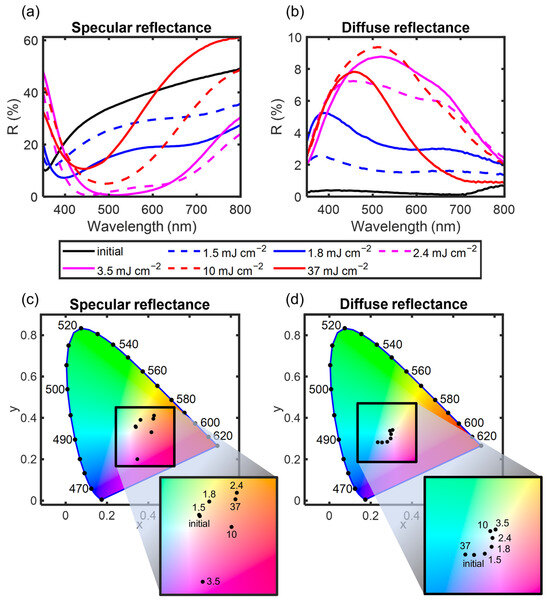 Spectral characteristics of specular (a) and diffuse (b) reflectance of unmodified (labeled “initial”) and modified (scanned 20 times with fluences: 1.8, 2.4, 3.5, 10, and 37 mJ cm−2) regions of the TAFIM sample. The International Commission on Illumination (CIE) 1931 chromaticity diagrams presenting calculated colors using D65 illuminant of (c) specular and (d) diffuse reflectance.