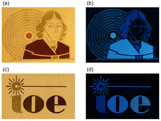 Laser-written images on the TAFIM sample. Images were collected using an optical microscope in (a,c) bright field and (b,d) dark field mode. (a,b) Sketch of Nicolaus Copernicus and the solar system (modified open source image [64]). (c,d) The logo of the Institute of Optoelectronics of the Military University of Technology. Modified regions were scanned 20 times with fluence in the 1.8–21 mJ cm−2 range. The Copernicus image size is 8.7 × 6.6 mm, while the logo image size is 5.9 × 3.7 mm.