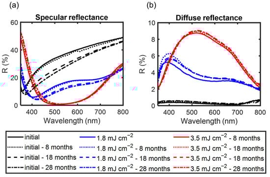 Time stability of the reflectance of the TAFIM sample. Specular (a) and diffuse (b) reflectances of unmodified (initial) and laser-modified regions of the TAFIM sample were measured shortly after the fabrication (solid lines) and after storing in an ambient atmosphere for 8 (dotted lines), 18 (dashed lines), and 28 (dash-dotted lines) months. The modified regions were scanned 20 times with fluence of 1.8 (blue lines) and 3.5 mJ cm−2 (red lines).