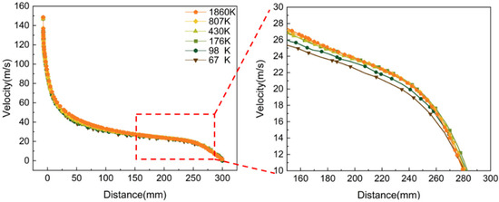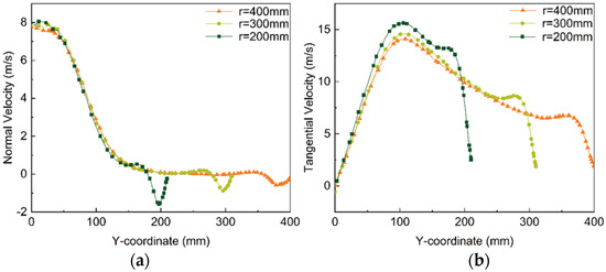 Figure 8 shows the normal and tangential velocity distribution curves during spraying on the outer wall at different radii, which demonstrates the same overall trend as observed during inner wall spraying. Additionally, as the radius of the spherical surface decreases, the normal velocity decreases and the tangential velocity increases of more rapidly. This is due to the increasing curvature of the spherical surface as the radius decreases. As seen in Figure 7 ➁, the angle between the velocity and the tangential direction of the wall continuously decreases with smaller radius. This results in a larger tangential component of the flow field velocity, making the reduction in normal velocity and increase in tangential velocity more pronounced.