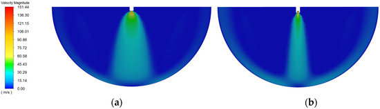 It can be observed in Figure 3 that the paint phase moved towards the wall in a typical fan-shaped pattern, with a maximum velocity of 151.44 m/s right after exiting the nozzle. As the spray flow field developed towards the wall, it impacted the wall at approximately 20 m/s. In the near-wall region, the uncoated paint phase began to spread outwards from the wall and eventually dispersed from the exit boundary of the flow field.