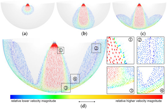 Figure 7 shows the changes in velocity vectors in the YZ plane over time during spraying on the outer wall of the spherical surface. Figure 7a,b is similar to the conditions observed during inner wall spraying. From Figure 7c, it can be seen that after impacting the wall, the spray flow field transitioned from a free jet to a downward wall jet. Due to boundary layer separation, vortices were formed and continued to diffuse tangentially along the wall, gradually decreasing in size. Figure 7d shows the vector distribution of the fully developed flow field.