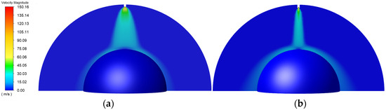 Figure 6 shows the velocity contours for spraying on the outer wall of the spherical surface. It can be observed that the paint initially spread in a fan-shaped pattern with a velocity of 150.16 m/s and the spray impacted the wall at approximately 20 m/s. After the paint front contacted the wall, it began to curl downward and spread tangentially along the wall. Finally, the uncoated spray eventually dispersed from the pressure outlet at the boundary of the flow field.