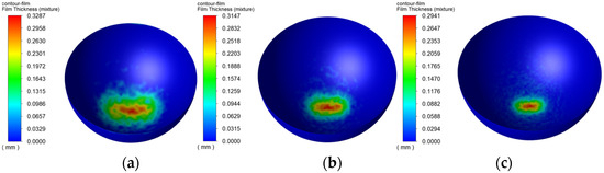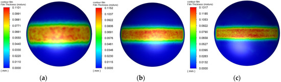 Film thickness contours of dynamic spraying on outer spherical surfaces. (a) r = 200 mm; (b) r = 300 mm; (c) r = 400 mm.