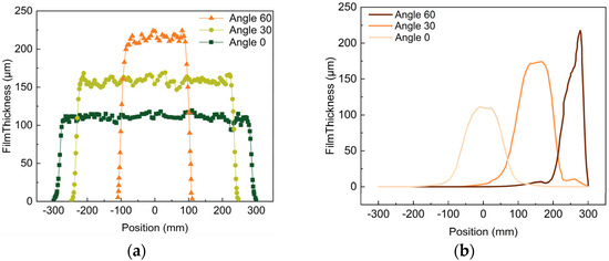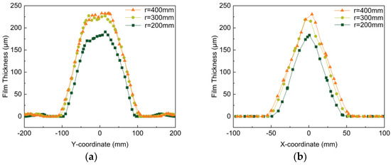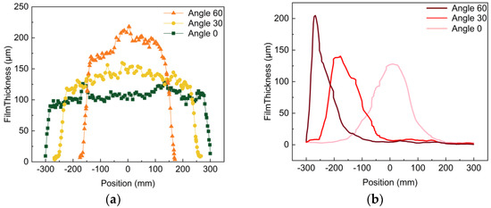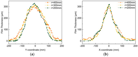 The distribution curves of film thickness are shown in Figure 16. As the spraying latitude increases, it is evident that the film thickness significantly rises, while the distribution of film thickness remains uniform at the same latitude. Additionally, the film thickness distribution still shows a peak that deviates from the center of the film, trending towards higher latitudes.