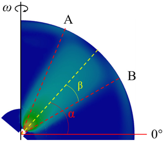 To study the eccentric distribution of film thickness, Figure 17 illustrates a schematic of the flow field at a certain moment during spraying along the α° latitude. Since the spray axis passed through the center of the sphere for both the inner and outer wall spraying, the schematic for inner and outer wall spraying was similar; here, inner wall spraying is used as an example. As shown in Figure 17, the spraying angle is α, the spray diffusion half-angle is β, and the red dashed line represents the edge of the spray after linear processing. Points A and B are the intersections of the spray flow field with the wall on either side. If the radius of the spherical surface is R and the angular velocity of the dynamic fluid region is ω, the linear velocity of point B at a low latitude during spraying is given by: