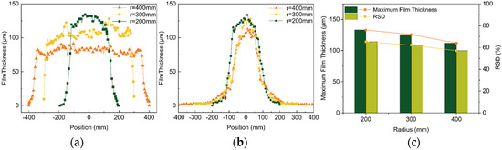 The film formation cloud maps for the inner walls of spherical surfaces with different radii are shown in Figure 18, exhibiting the same film thickness distribution trend as discussed in previous sections. The film thickness curves along the spray gun movement direction and the long-axis direction for different radii are plotted in Figure 19. As the radius of the spherical surface decreased, the inner wall film thickness increased, with maximum film thicknesses reaching 133.1 μm, 125.8 μm, and 112.0 μm, respectively. Additionally, the inner wall of the spherical surface with a smaller radius showed a larger film length. Based on the analysis of static spraying film formation characteristics, the mechanism was as follows: In spherical surfaces with smaller radii, the normal velocity of the flow field near the wall was higher, resulting in increased film thickness and a longer film long axis. From Figure 19c, it can be observed that as the spherical surface radius increased, the RSD values for film thickness were 65.23%, 62.17%, and 57.05%, respectively. Film uniformity improved with increasing radius. This was because, with an increasing radius, the curvature of the surface decreased, and the geometric features of the surface approached a plane, thereby enhancing the uniformity of the film thickness.