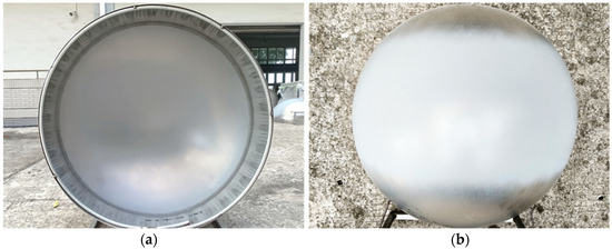 The spherical workpieces for spraying experiments are made of galvanized steel plates, which are formed using a point pressing method. Some locations are reinforced with steel bars and welded to a base. The surface of the workpieces underwent ST3–grade rust removal to ensure good adhesion of the coating. In the spraying experiments, the physical parameters of the coating, the spray pressure, and the speed of gun movement were consistent with those of the numerical simulation. After spraying, the workpieces were left for natural drying, with the actual drying time for the coating being approximately 10 h. Subsequently, the dry film thickness was measured using an AR932 coating thickness gauge (Wanchuang Electronic Products Co., Ltd., Dongguan, China). After calibrating the instrument, measurement points were set every 1 cm, and each point was measured three times. The average of these three measurements was taken as the film thickness data for that point, provided that the error did not exceed 1 μm.
