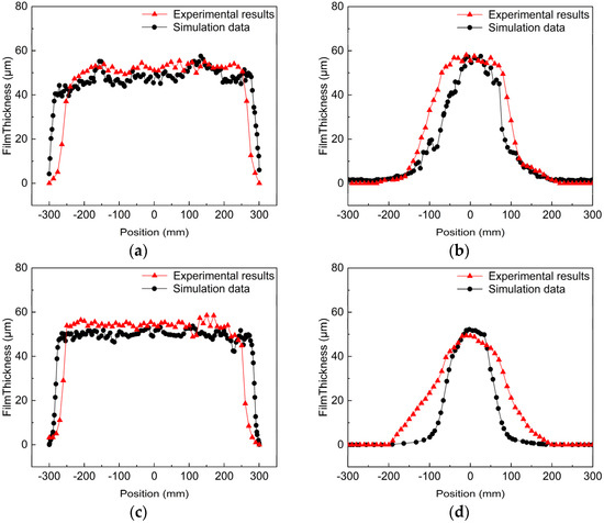 Comparison of film thickness curves between experimental results and simulation data. (a) Movement direction of inner surface; (b) long-axis direction of inner surface; (c) movement direction of outer surface; (d) long-axis direction of outer surface.