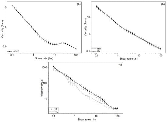 Viscosity curves as a function of shear rate for CNF and emulsions at day 1 and after 15 days are shown in Figure 1. Pseudoplastic (shear-thinning) behavior was observed for all samples, which is favorable for paper coating production. Specifically, in Figure 1a, the CNF suspension exhibits a reduction in viscosity with an increasing shear rate. Additionally, after 10 s−1, a slight increase in viscosity is observed due to the reorganization of cellulose nanofibers and the formation of aggregates [52,53,54]. This behavior agrees with previous reports of the rheology of CNFs in the literature [55,56,57]. This occurs because the nanofibers tend to align in the direction of the applied shear, reducing network resistance and facilitating flow, which in turn decreases viscosity [58].