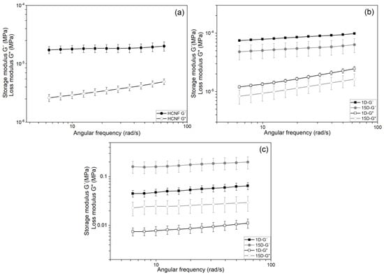 Frequency sweeps for CNF suspension and Pickering emulsions: (a) 1 wt% CNF suspension, (b) CNF/PLA Pickering emulsion, and (c) CNF/CB Pickering emulsion.